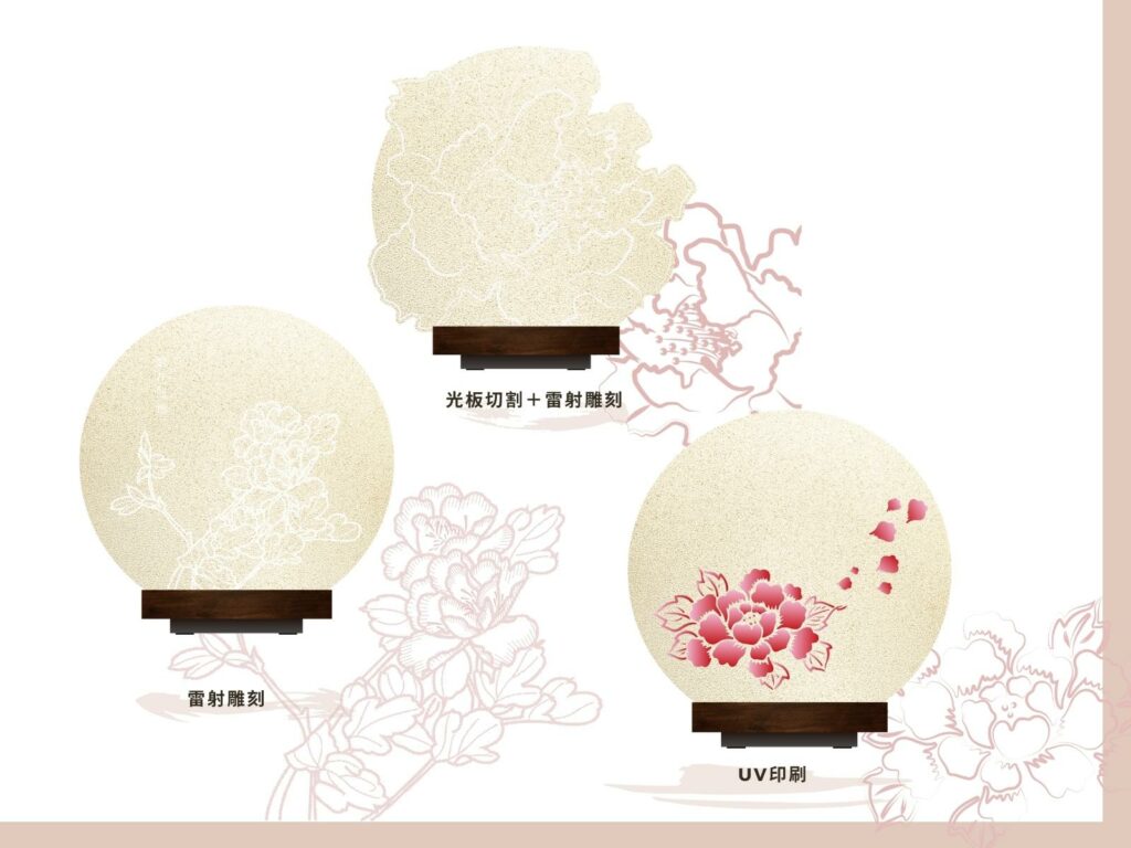即便是單件禮品,也可透過在標準禮品的光板與底座上雕刻文字/圖案,給送禮對象一個專屬的祝福,例如給結婚新人、給入厝友人的祝福話語,成為一個獨一無二的專屬禮品。
