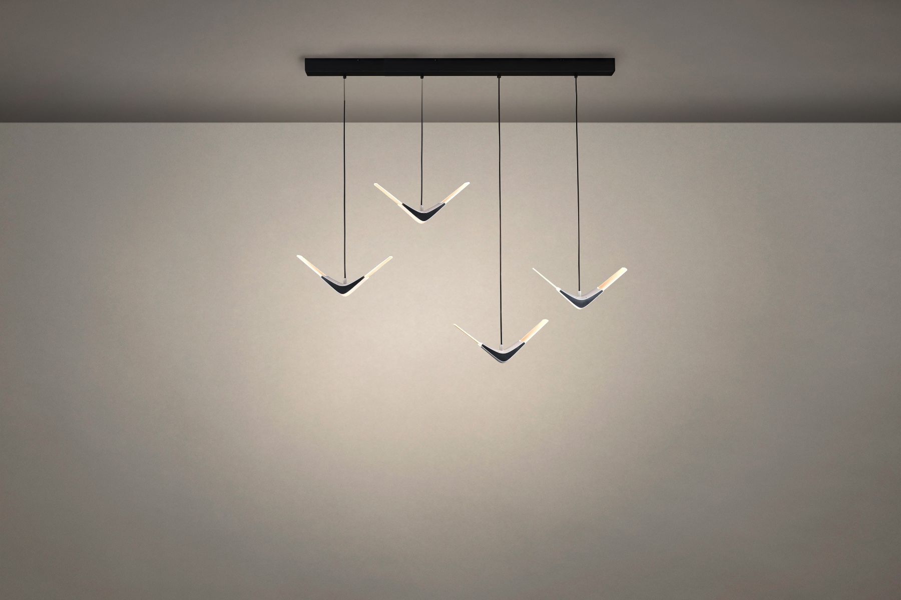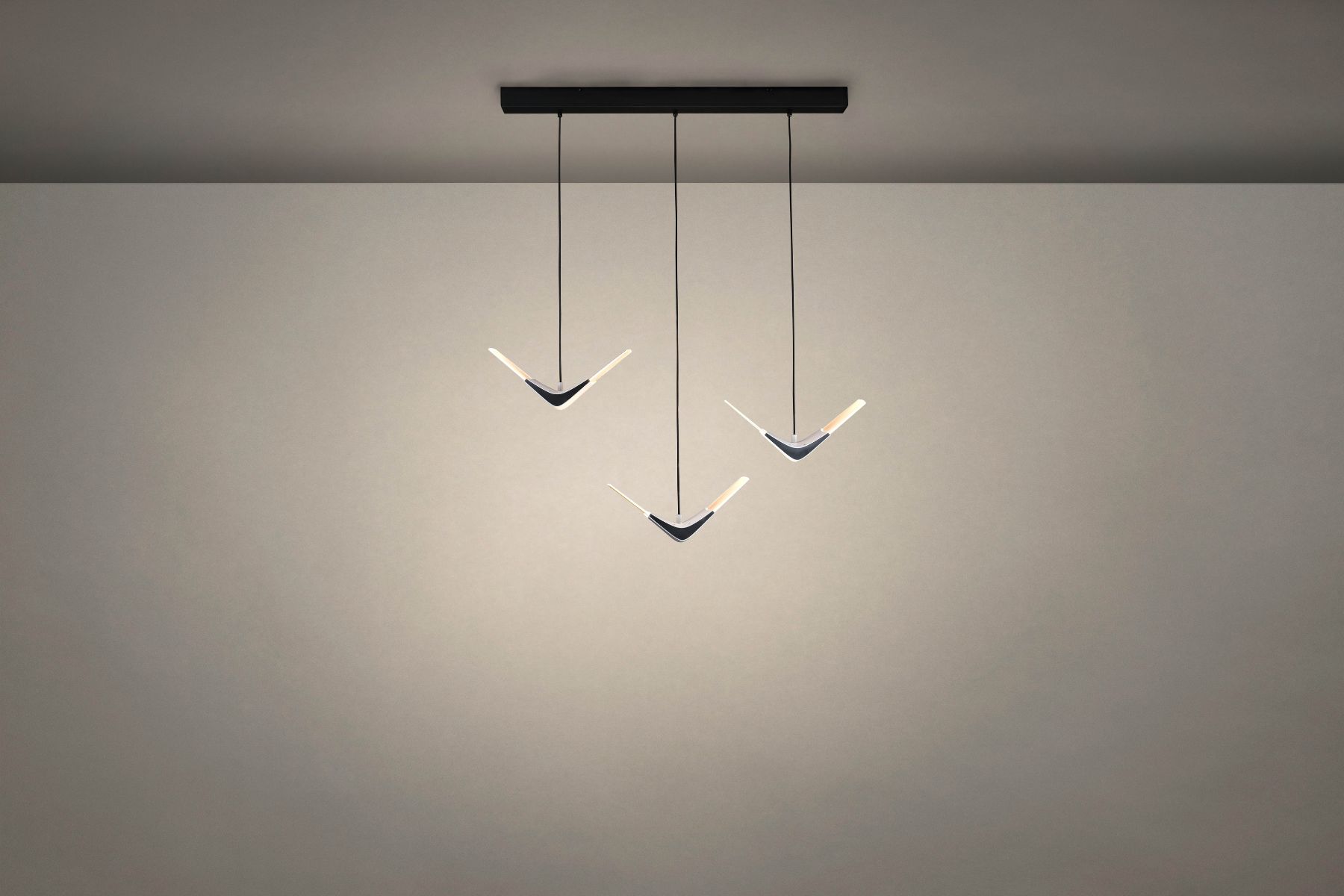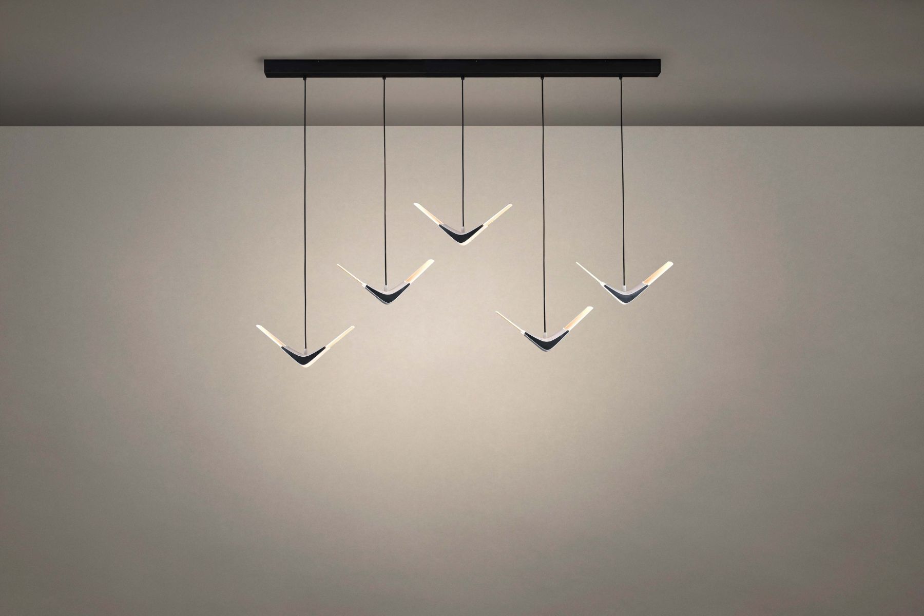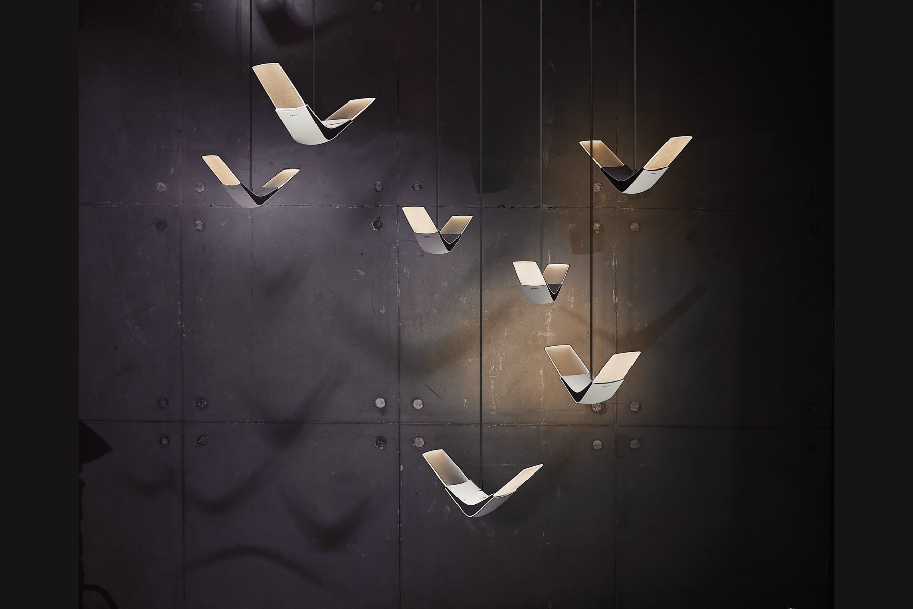 自在飛翔吊燈將自然美學帶入現代生活,特殊的絲紋發光燈板散發著舒適的光,優雅的雙翼如飛鳥翱翔,在空間中創造一幅美麗的景,為緊湊而忙碌的生活提供一個放鬆與休憩的角落,一種身心的自在。自在飛翔上下兩種不同的姿態,一盞孤傲而純粹,多盞混搭壯觀如海鷗群飛,穿透空間展現獨特景致,劃出美麗天際線。
