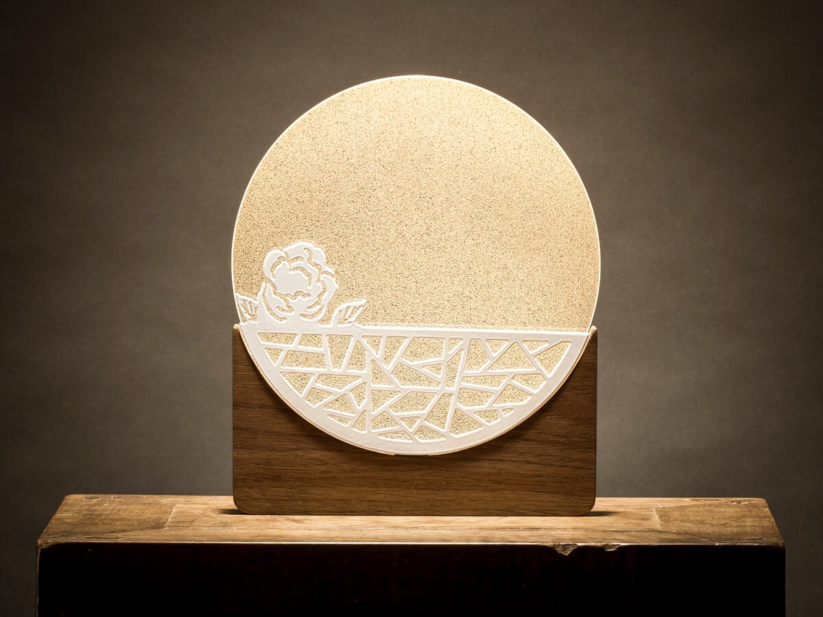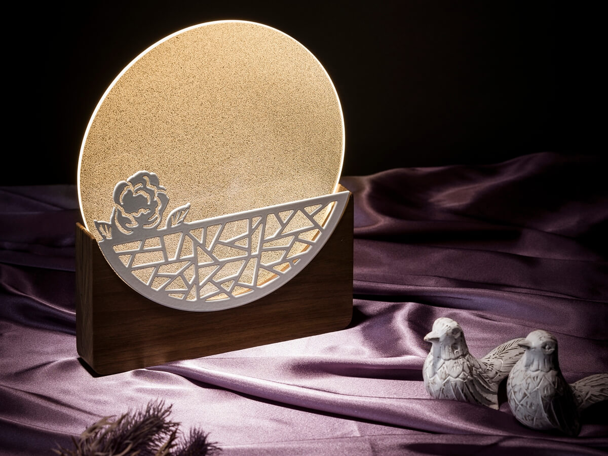 「慈母手中線遊子身上衣」母親藉著窗光織衣的情景,成為冰芬創作的緣起。山茶在冰雪中吐著芬芳似母親堅毅不退縮的心,圓窗透著暖光如母愛環繞,一盞純淨無瑕獻給母親的光。