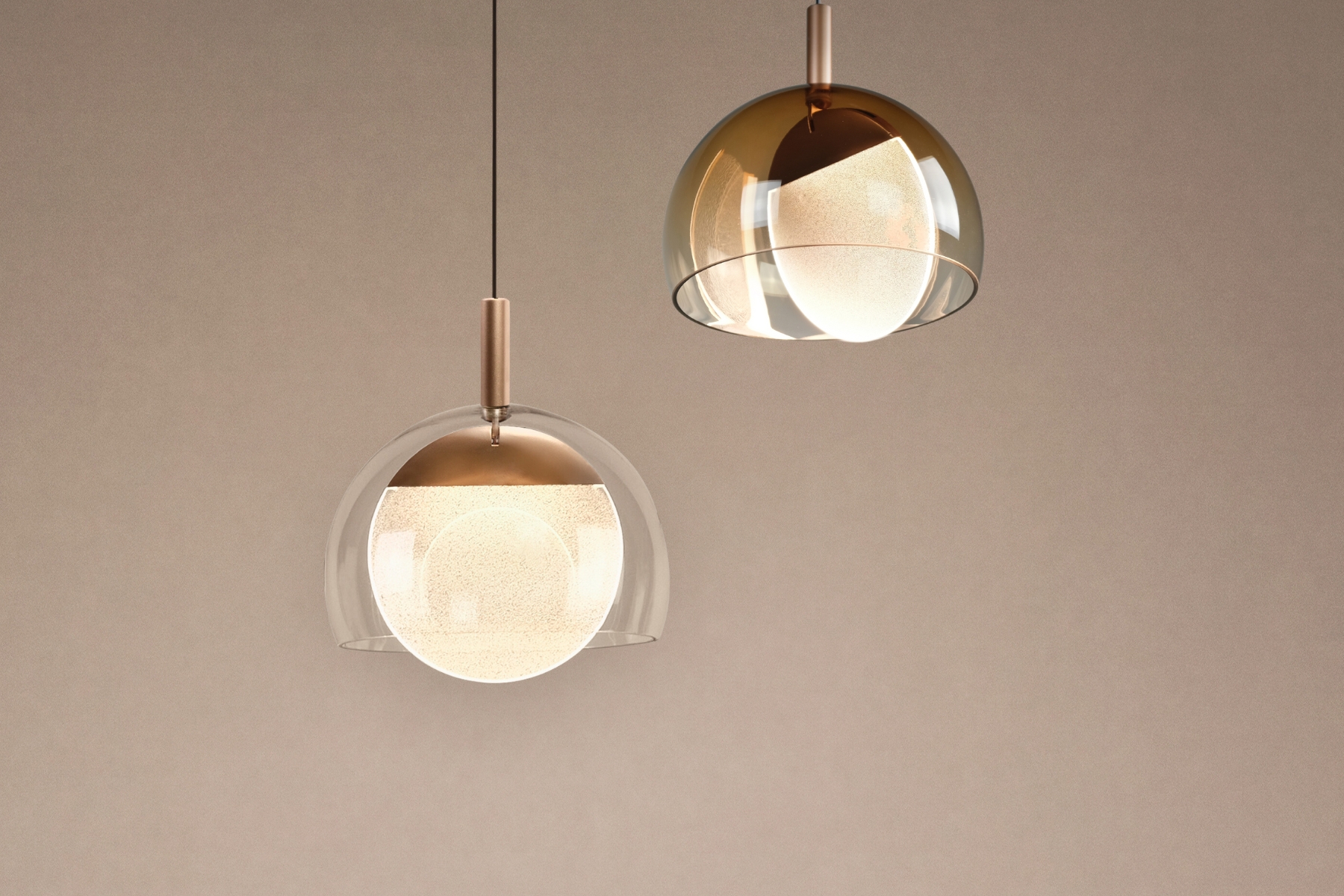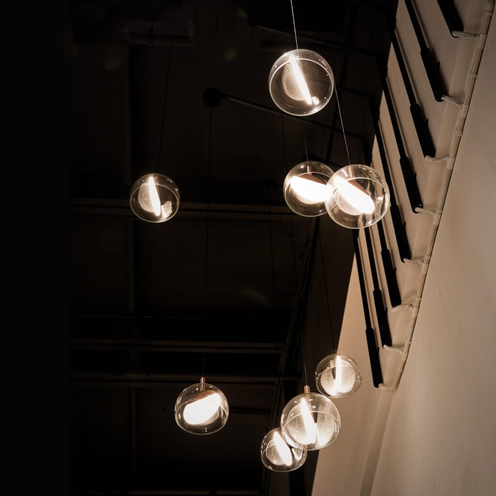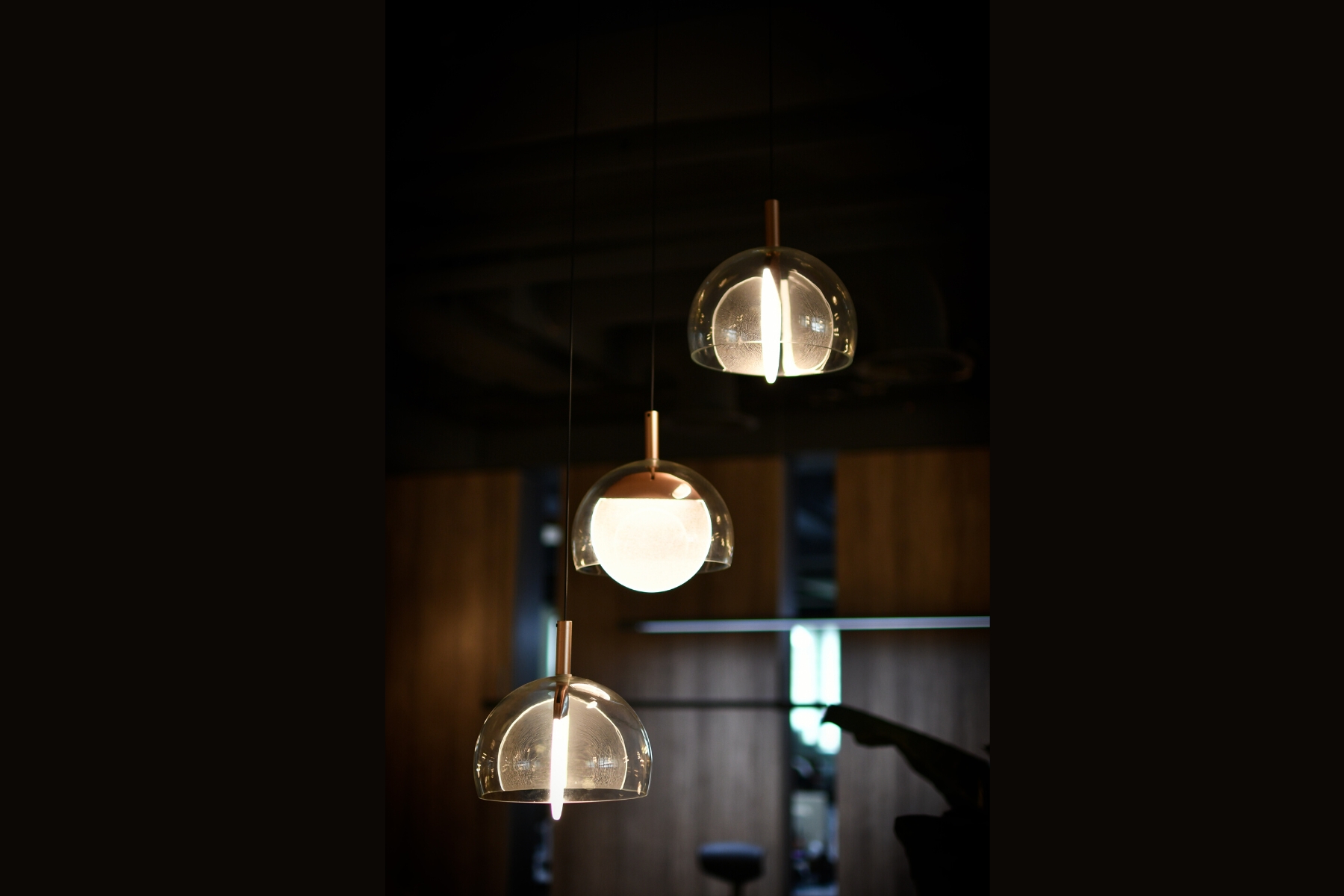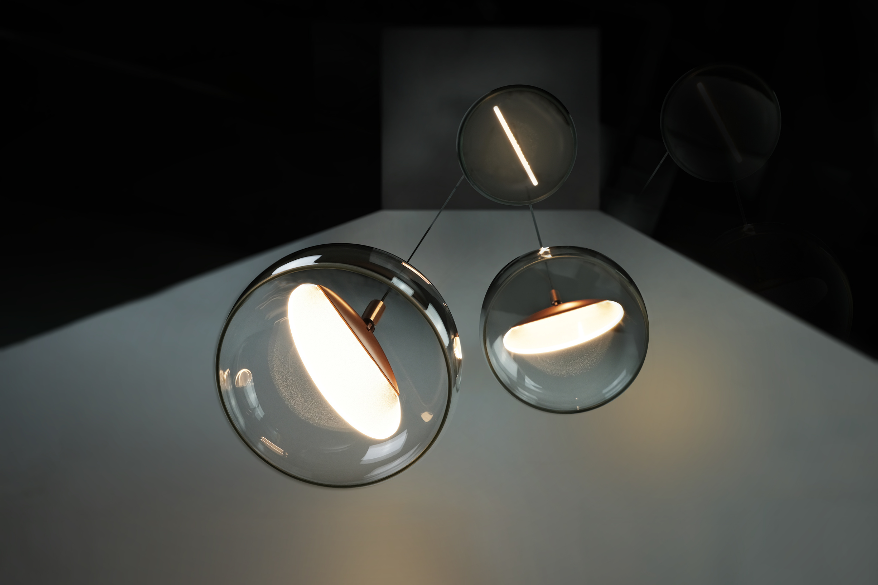 手工口吹玻璃塑造每一個燈體的獨一,將導光板特殊的面光源來回反射出豐富多樣、真假虛實交織的光環。
